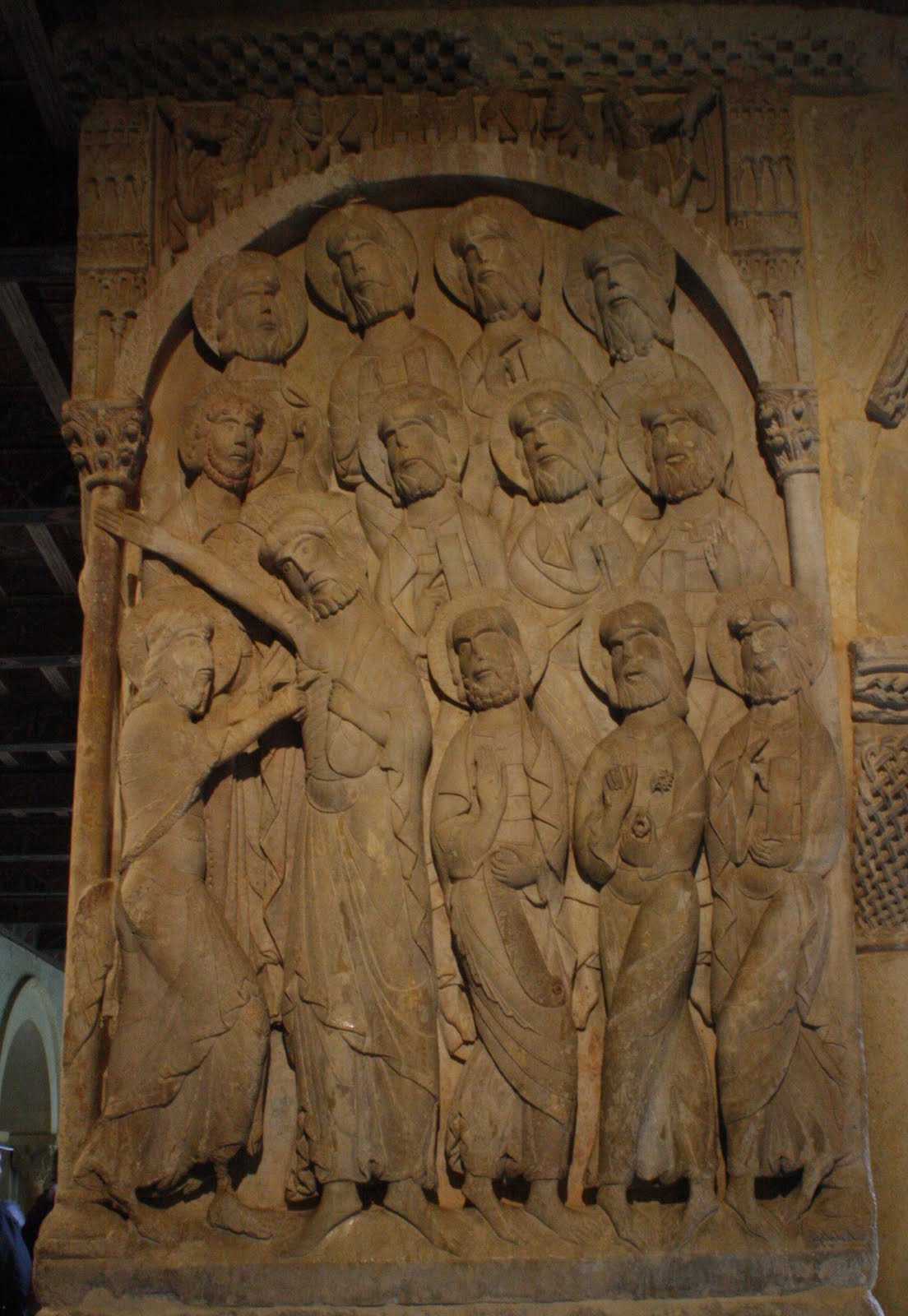 El primer taller elaboró los relieves de las esquinas del sureste que representan la Ascensión y Pentecostés; la Sepultura y Resurrección, el Descendimiento, los Discípulos de Emaús y la Duda de Santo Tomás. Las figuras se representan con un volumen cuya expresión se reduce al mínimo.